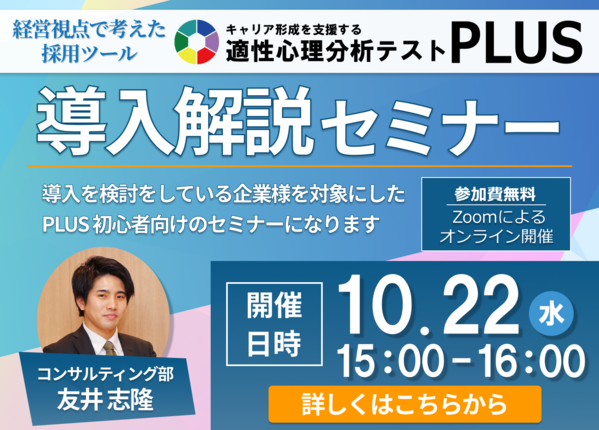 この度、「適性心理分析テストPLUS® 導入解説セミナー」10月開催の