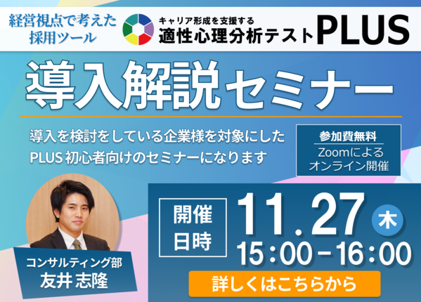 この度、「適性心理分析テストPLUS® 導入解説セミナー」11月開催の